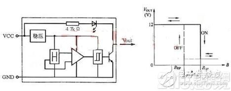 霍爾開關電路由反向電壓保護器、精密電壓調節器、霍爾電壓發生器、差分放大器、施密特觸發器、溫度補償器和互補型集電極開路輸出器等七部分組成。下面我們簡單介紹一下各部分的功能。
