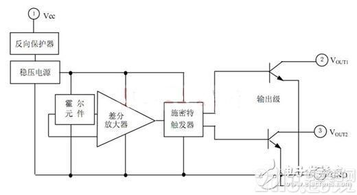 霍爾開關(Hall switch)又稱霍爾數字電路,是一種新型的電器配件,由反向電壓保護器、精密電壓調節器、霍爾電壓發生器、差分放大器、施密特觸發器、溫度補償器和互補型集電極開路輸出器等七部分組成,具有無觸點、低功耗、長使用壽命、響應頻率高等特點,內部采用環氧樹脂封灌成一體化,能在各類惡劣環境下可靠的工作。該電路由于具有高達400 mA的負載能力,并且是互補型輸出,因此,它是無刷風扇最理想的器件。