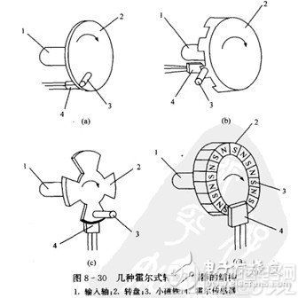 (1)霍爾式轉速傳感器。圖8-30示出了幾種霍爾式轉速傳感器的結構。