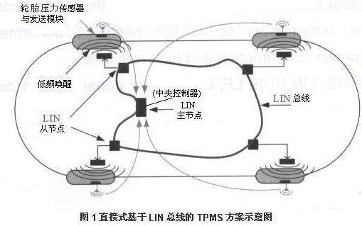 由于將研討LIN總線應(yīng)用于TPMS,并用MCU、RF和傳感器實現(xiàn)TPMS見圖1直接式基于LIN總線的TPMS方案示意圖。而實用 TPMS示意的輪胎氣壓監(jiān)測系統(tǒng),是由與輪胎閥一體的4個訊號發(fā)射器、收訊天線、收訊器及訊號顯示儀四類部件組成的。為此有必要先對汽車應(yīng)用的LIN總線有關(guān)技術(shù)作介紹。