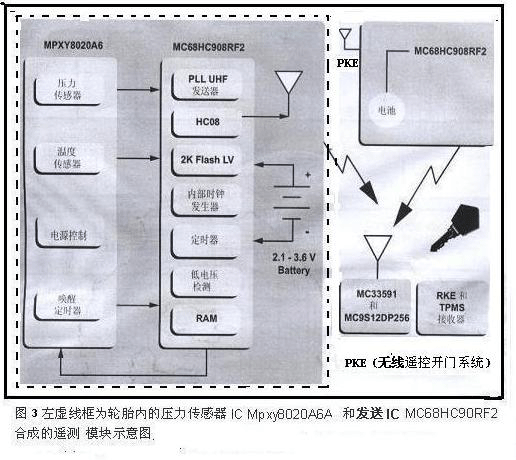 圖3左虛線框為輪胎內(nèi)的壓力傳感器IC和發(fā)送IC為freescale公司的Mpxy8020A6或Mpxy8040A芯片和 MC68HC90RF2芯片。 Mpxy8020A6它內(nèi)含壓力傳感器、溫度傳感器、電源控制和電池電壓檢測,喚醒功能的定時器,屬表面微機械CMOS加工工藝,SSOP封裝;而UHF 發(fā)送器+MCU(Flash)的MC68HC90RF2內(nèi)含為2K用戶FLash ROM,定時器,集成的射頻(RF)發(fā)送器,低電壓檢測和RAM及內(nèi)部時鐘發(fā)生器。則整個圖3左虛線框為Mpxy8020A6A與MC68HC90RF2 合成的遙測模塊示意圖。其圖3右側(cè)MC33591為UHF接收器內(nèi)含鎖相環(huán)(PLL)超高頻開關(guān)鍵控(00K)接收器;MC912DP256 接收端控制器內(nèi)含256KFLash,12KRAM,4KEEPROM,up to 5CAN,1xJl850,256MHz工作須頻率。