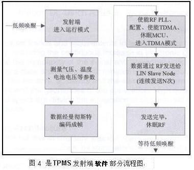在設(shè)計一個運行穩(wěn)定、功效高的系統(tǒng)時,需要考慮的第一個因素就是軟件。因為車輪模塊通常是用微控制器來執(zhí)行命令的,所以應(yīng)采用一種智能化算法實現(xiàn)預(yù)期的功效。其次,使用低頻功能是控制TPMS的非常有效的方法。在使用低頻接口時,感應(yīng)模塊可以始終處于電源關(guān)閉模式,只有在收到喚醒信號后,傳感器才會進行測量和數(shù)據(jù)傳輸。除了降低功耗以外,低頻接口還具備設(shè)計靈活性和其他一些優(yōu)勢。例如,低頻通訊可使系統(tǒng)通過低頻接口向微控制器發(fā)送特定命令,以對輪胎進行重新校準和定位。值此以MLX90603帶有LF(Low Frequency)接口為例的發(fā)送模塊軟件設(shè)計方案作一說明。MLX90603帶有LF(Low Frequency)接口,因此可以在大部分時間內(nèi)將發(fā)射端處于休眠模式,需要時通過低頻信號將其喚醒,進而進行測量并通過TH720x發(fā)射芯片將測量得到的數(shù)據(jù)發(fā)送給相應(yīng)的LIN從節(jié)點。圖4是發(fā)射端的部分流程圖。本方案中,充分利用了MLX90603 中集成的TDMA(Tag Direct Memory Access)模塊,在MLX90603采集完數(shù)據(jù)后,配置TDMA、RF所需的寄存器,即可將MLX90603進入Sleep mode,利用TDMA模塊自動把要發(fā)射的數(shù)據(jù)傳輸給RF,以充分節(jié)省功耗。由于發(fā)射端工作在惡劣環(huán)境下,為了保證發(fā)送端和接收端進行可靠的數(shù)據(jù)傳輸,考慮到本應(yīng)用信息量小、數(shù)據(jù)簡單的特點,我們采用信息冗余的方法來保證數(shù)據(jù)的可靠接收,即一幀數(shù)據(jù)發(fā)送N次。根據(jù)采集到的數(shù)據(jù)動態(tài)調(diào)整發(fā)送次數(shù)N。