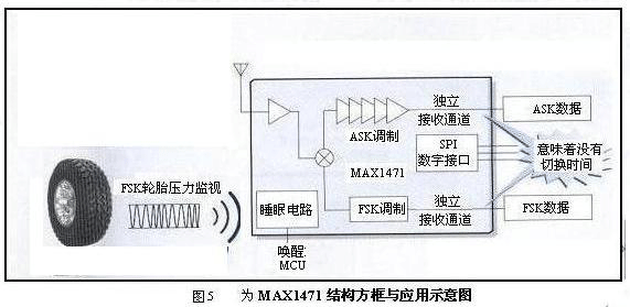 使用MAXl471雙通道接收器同時捕捉兩種信號,即能同時接收ASK和FSK(頻率變換數(shù)據(jù)),模式間切換時間為零。針對同時需要對 ASK和FSK解碼的低成本系統(tǒng)設(shè)計,MAXl471雙模接收器還可進行自輪詢,器件可保持長達8分鐘的睡眠模式,并可喚醒微處理器,以進一步節(jié)省能源。 MAXl47l工作于300MHz至450MHz,包括內(nèi)置的42dB(兆型值)鏡頻抑制混頻器,不需常見的SAW濾波器。MAXl471內(nèi)置一個可用于 3.3V或5V的穩(wěn)壓器,可在低至2.4V的電壓下工作。圖5為MAX1471結(jié)構(gòu)方框與應(yīng)用示意圖,從圖中表看出MAX1471也可用于汽車輪胎壓力監(jiān)視系統(tǒng)中接收器。