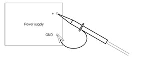 示波器是測試電源紋波噪音的工具,在測試中如何選擇探頭、帶寬、采樣率、耦合方式及接地都會對測試結果有所影響。一般的測試方法有甩線測試法、平行線測試法及靠測法等,甩線測試法如下圖所示: