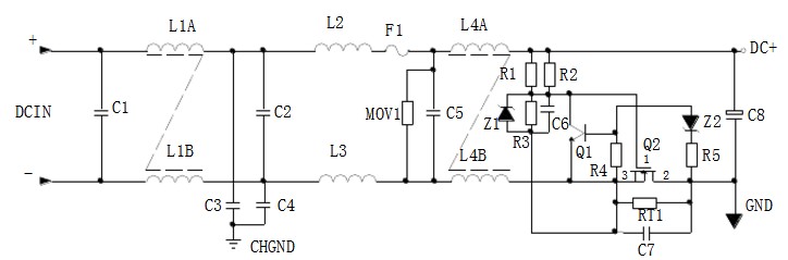 C1、L1、C2組成輸入濾波電路,跟上述的AC輸入濾波電路的作用是一樣的,R1、R2、R3、Z1、C6、Q1、Z2、R4、R5、Q2、RT1、C7組成抗浪涌電路。在起機的瞬間,由于C6的存在Q2不導通,電流經RT1構成回路。在起機的瞬間電流在RT1上產生的壓降增大,Q1導通使Q2沒有柵極電壓不導通,RT1將會在很短時間燒毀,以保護后級電路。