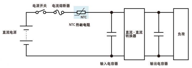 在直流-直流轉換器等的直流電源電路中,NTC熱敏電阻用作電源熱敏電阻,可以有效地抑制浪涌電流,輸入和輸出電容在接通電源時充電。NTC熱敏電阻的電阻在通電后變得非常低,達到比使用固定電阻時更低的功率損耗。如下圖所示: