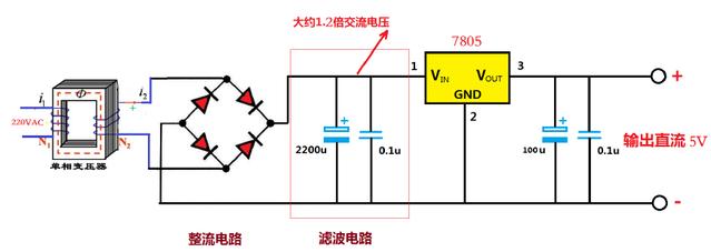 需要準(zhǔn)備的元器件材料有220V轉(zhuǎn)6V的單相交流變壓器、整流橋(可用4個(gè)二極管代替)、LM7805及電容。原理為220V交流電經(jīng)過變壓器降壓為6V交流電,然后經(jīng)過全橋整流,再濾波,得到的直流電壓約為6V交流電的1.2倍左右,最后經(jīng)過LM7805三端線性穩(wěn)壓器穩(wěn)壓輸出5V。電路原理圖如下圖所示: