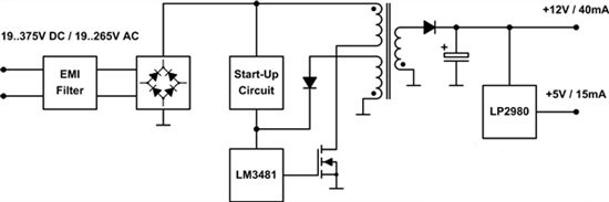 該要求為19至265VAC和19至375VDC的小功率反激式轉換器(在500mW的范圍內),小功率反激式參考設計需要具備兩路輸出。一個輸出軌提供微控制器與模擬電路(電流為15mA時電壓為5.0V),另一個輸出軌則在電流為40mA時提供12V的電壓以控制繼電器。因為輸入和兩路輸出需要2.5kV的隔離電壓,所以首先想到了結構簡單、廣為人知的反激式轉換器。