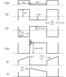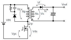 關(guān)于反激式的基本工作如上圖所示。MOSFET為ON時(shí),電流經(jīng)過變壓器初級(jí)繞組,蓄積電能。此時(shí),二極管為OFF。MOSFET為OFF時(shí),蓄積的電能通過二極管,從變壓器的次級(jí)繞組向外輸出,之后再經(jīng)由整流-平滑,產(chǎn)生DC電壓。上述工作模式也稱為ON/OFF方式。各部的波形如下圖所示。